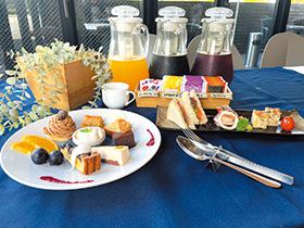 セット内容:【ドルチェ】・モンブラン・チェリータルト・チョコテリーヌ・キャロットケーキ・バナナバウンドケーキ・ぶらっとオレンジムース 【軽食】・自家製フォカッチャサンド・魚介のマリネ・フリッタータ 【ドリンクバー】・オレンジジュース・アップルジュース・ぶどうジュース・コーヒー・紅茶