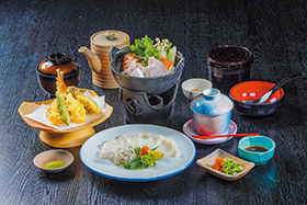 ・とらふぐ刺し(皮付) ・天ぷら ・てっちり鍋 ・茶碗蒸し ・ご飯 ・香物 ・吸い物