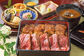 石山寺の境内にある創業以来変わらぬ「志じみ釜めし」やうな重など、地産地消を活かした絶品料理の名店です。今回は、近江牛を特製タレで炭火焼きし、うなぎのかば焼きと一緒に組み合わせた、滋賀の最高級の味を詰め込んだ、贅沢な御膳をお楽しみください。
