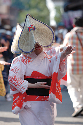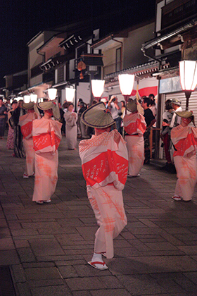 元禄時代から約300年の歴史を有する伝統行事で、毎年9月1日から3日にかけて行われ、今も昔も多くの人々が訪れます。夕暮れを過ぎ、ぼんぼりに淡い灯がともるころ、哀愁を帯びた三味線と胡弓、太鼓の音色と、味わいのある唄に合わせて踊り手たちが情緒豊かに踊りながら練り歩きます。300年余踊りつがれてきたその唄と踊りは、叙情豊かで気品高く、哀調の中に優雅な趣を有しています。