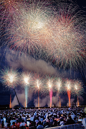 一流の花火師たちが技を競い合い、音楽とシンクロした華麗な演出や迫力満点の仕掛け花火が観客を魅了します。