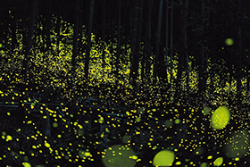 西粟倉村は岡山県内でも数少ないヒメボタルの生息地。毎年7月には「旧大茅スキー場」から「若杉天然林」の周辺で、美しく幻想的な光景を見ることができます。木立の間を縫うように輝くヒメボタルの光は絶景! まるで“光の絨毯”のようです。